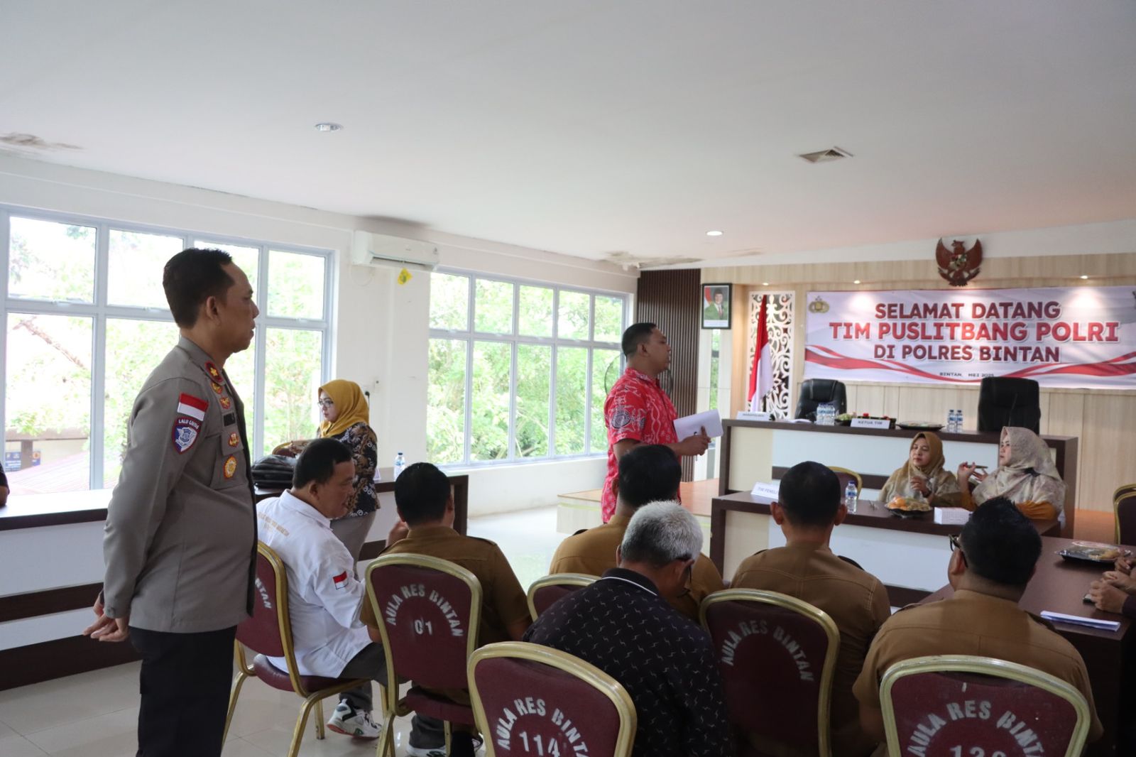 Rombongan Tim Puslitbang Polri dipimpin langsung oleh Kombes Pol Rido Rolly Maruli bersama anggota tim AKBP Dadang Sutrasno, Penata TKI Triyanti dan Penata Ubadillah. Kedatangan mereka disambut hangat oleh Wakapolres Bintan, Kompol Heri Sujati S.H beserta jajaran.