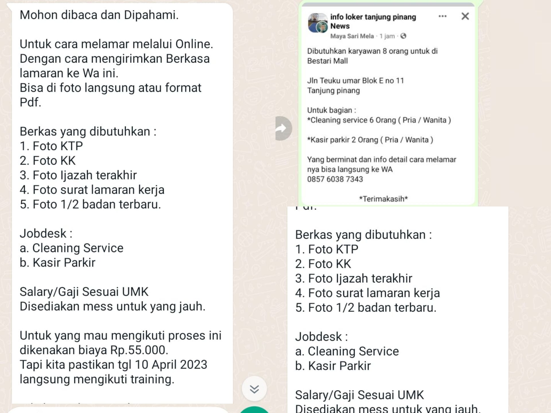 Yang berminat dan Info detail cara melamarnya silahkan bisa langsung Wa ke Nomor 0857-6038-7343″ tulis akun Facebook tersebut.