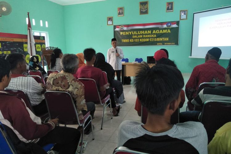 HarianMemoKepri.com, Bintan – Komando Distrik Militer (Kodim) 0315/Bintan bekerja sama dengan Kantor Kementrian Agama (Kemenag) Kabupaten Bintan dalam menggelar penyuluhan agama tentang iman dan taqwa, pada proyek non fisik TMMD Ke- 103 yang bertempat di Balai Desa Pengudang, Kecamatan Telok Sebong, Kabupaten Bintan, Rabu, (24/2018).