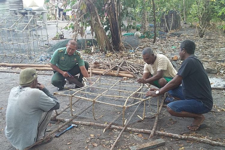 Di lokasi Babinsa Pengudang, Pelda Pantun Sibarani tampak ikut merangkai kayu yang akan dijadikan bubu yang menjadi alat tangkap ikan.