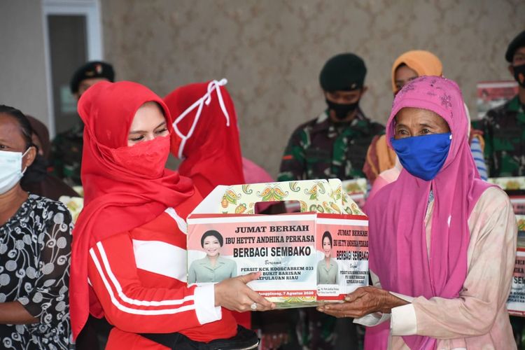 Harianmemokepri.com | Tanjungpinang — Ketua Persit Kartika Chandra Kirana Koorcab Rem 033 PD I Bukit Barisan Ny. Imelda Harnoto didampingi pengurus bagikan ratusan paket sembako kepada masyarakat sekitar makorem dan Tanjungpinang, Jumat (07/20).