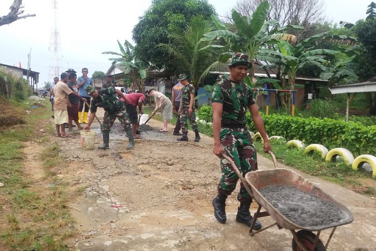 Anggota Koramil 03/Binut bersama Warga Desa Lancang Kuning melakukan Semenisasi dan penambalan Jalan yang berlubang. (Foto. Hmk)