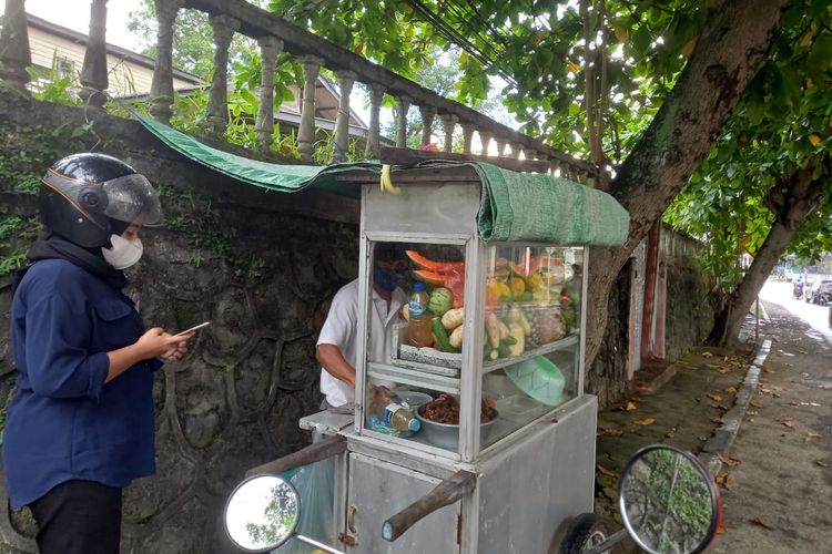 Misom ( 59 ) Pedagang Rujak Legend sambil menunggu pelanggan di tengah cuaca yang kurang bersahabat menerangkan, pendapatannya biasa bisa sekitar Rp 500ribu – Rp 800ribu sekarang hanya bisa mendapat Rp 200ribu – Rp 500ribu akibat Pandemic.