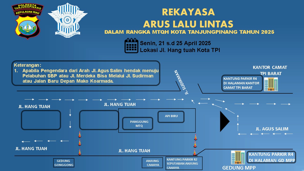 HARIANMEMOKEPRI.COM – Satuan Lalu Lintas (Satlantas) Polresta Tanjungpinang bersama Dinas Perhubungan (Dishub) akan menerapkan rekayasa lalu lintas selama pelaksanaan Musabaqah Tilawatil Qur’an dan Hadits (MTQH) XIX Tingkat Kota Tanjungpinang yang digelar pada 21–25 April 2025.