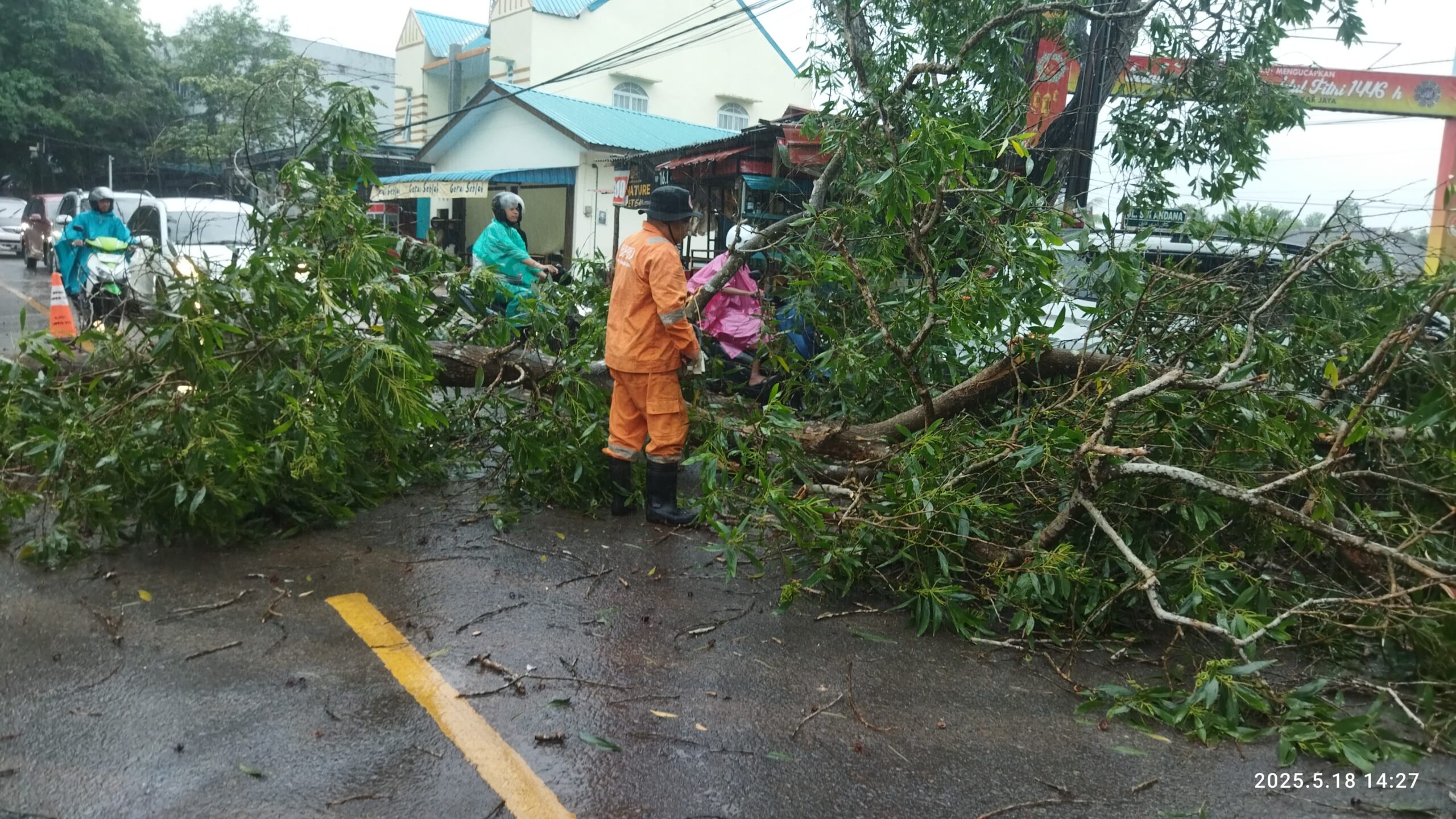 HARIANMEMOKEPRI.COM – Hujan deras yang mengguyur Kota Tanjungpinang sejak siang hingga malam hari, Minggu (18/5/2025), menyebabkan sejumlah insiden, salah satunya pohon tumbang di beberapa titik.