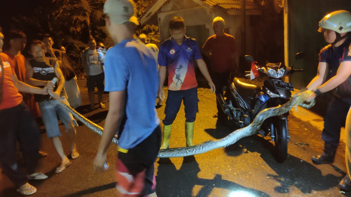 HARIANMEMOKEPRI.COM — Seekor ular sanca berhasil dievakuasi petugas Dinas Pemadam Kebakaran dan Penyelamatan (DPKP) Kota Tanjungpinang di Perumahan Griya Bestari, Blok D, Kelurahan Air Raja, Kecamatan Tanjungpinang Timur, Selasa (12/8/2025) malam.